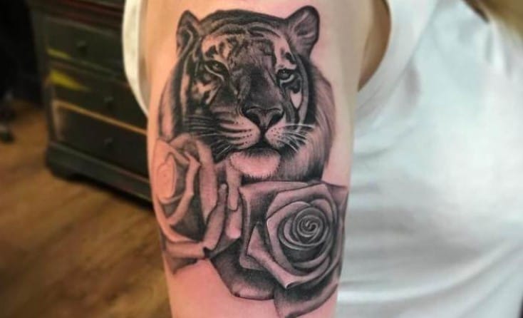 Upper Arm Tiger Rose Tattoo Art